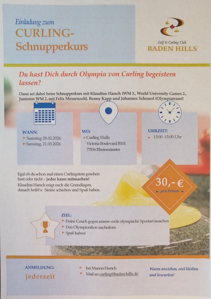 Auf Grund der großen Nachfrage, bedingt durch die Olympiade, bieten wir Interessenten zwei zusätzliche Schnupperkurs Termine, zum Preis von € 30,00, an. - Samstag, 28.02.2026 von 13:00 bis 15:00 Uhr